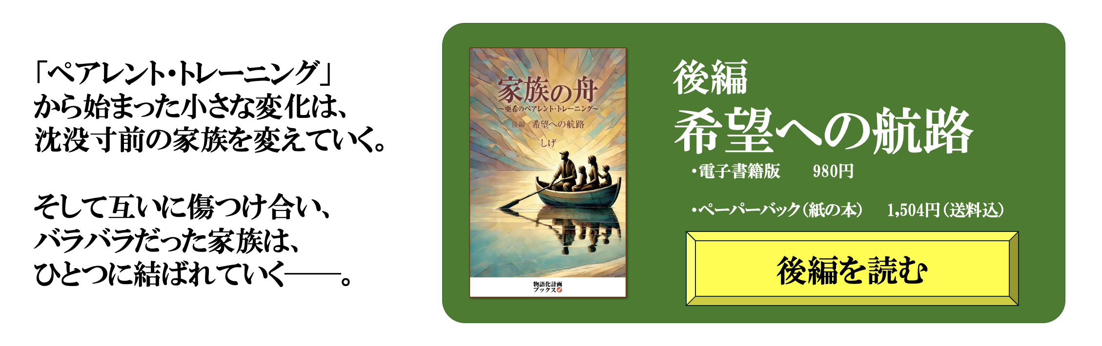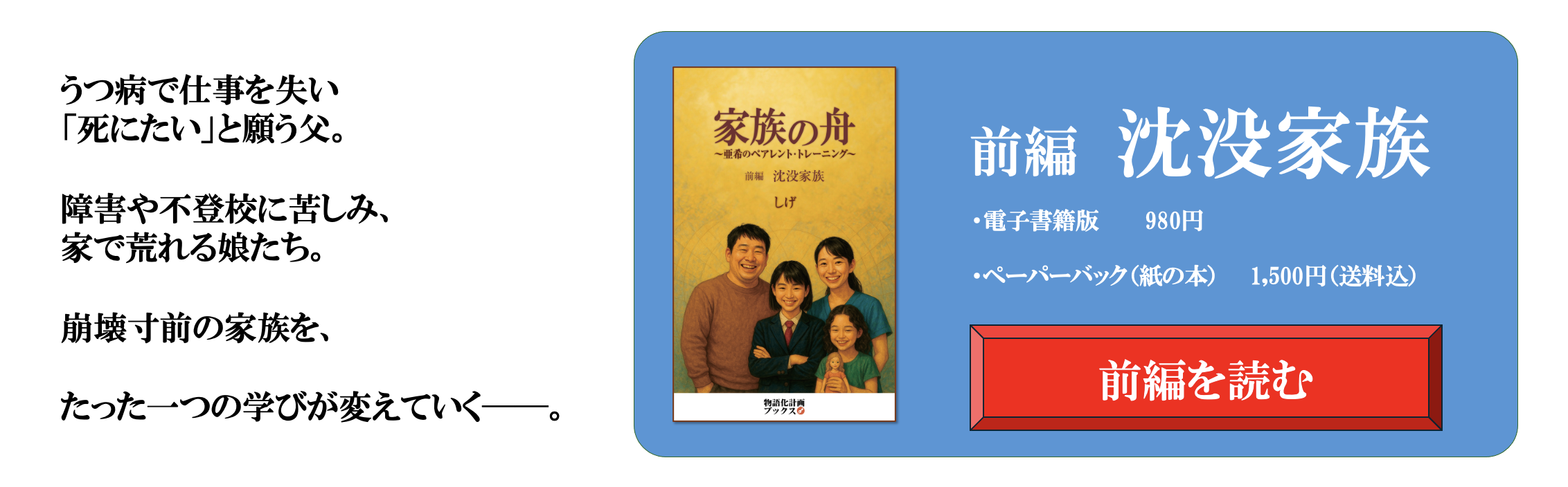 父・浩司が疑いながらこれを実践し始めた時、沈没しかけた家族に、新たな航路が生まれた。