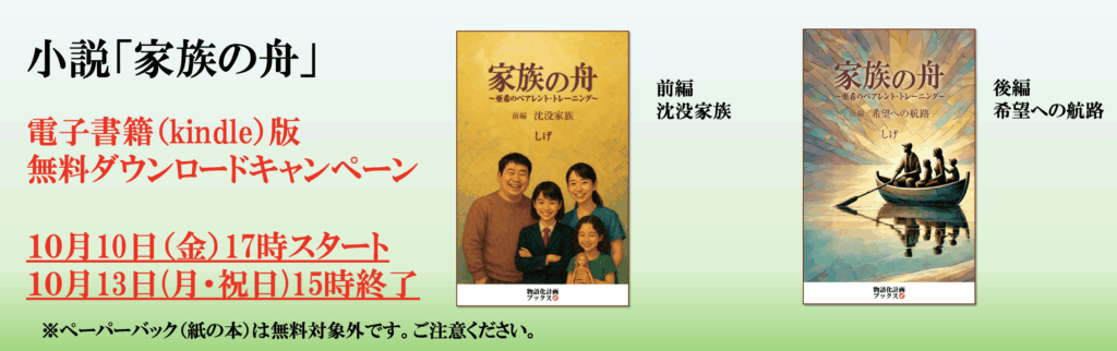 2025年10月10日 / 最終更新日時 : 2025年10月10日 nishiyama お知らせ 無料ダウンロードキャンペーン、開始しました! 🌟無料ダウンロード、スタートしました!🌟 🚢小説「家族の舟 〜亜希のペアレント・トレーニング〜」の無料ダウンロードキャンペーンが始まりました! 📲ダウンロードはこちらから👉 ・前編・沈没家族 ・後編・希望への航路 本日、私が勤めている児童デイの先輩の先生から、「前編は暗すぎて途中で読むのをやめようと思ったけど、後編は面白くて一気に読んで、感動して泣いた」と、ご講評いただきました。 ぜひこの機会に、無料で入手してください!🙇♂️ そして読まれた方はご感想をお寄せください! \ 最新情報をチェック / FacebookXBlueskyHatenaCopy